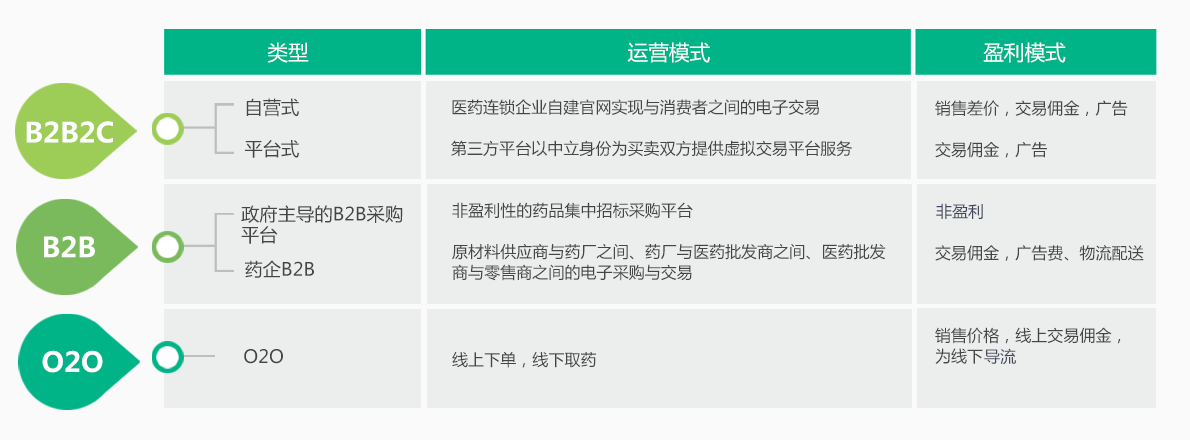 医药电商(Medicine E-commerce):指医疗机构、医药生产商、代理商、经销商、分销商、医药公司、医药信息提供商、第三方机构等以盈利为目的,以互联网及移动互联网为基础所进行药品保健品、器械等商品交易但不包括医疗咨询等服务的各种商务活动;包括B2B电子商务和B2C电子商务,不包括C2C,即以医疗和医药相关商品为核心的线上批发和零售。